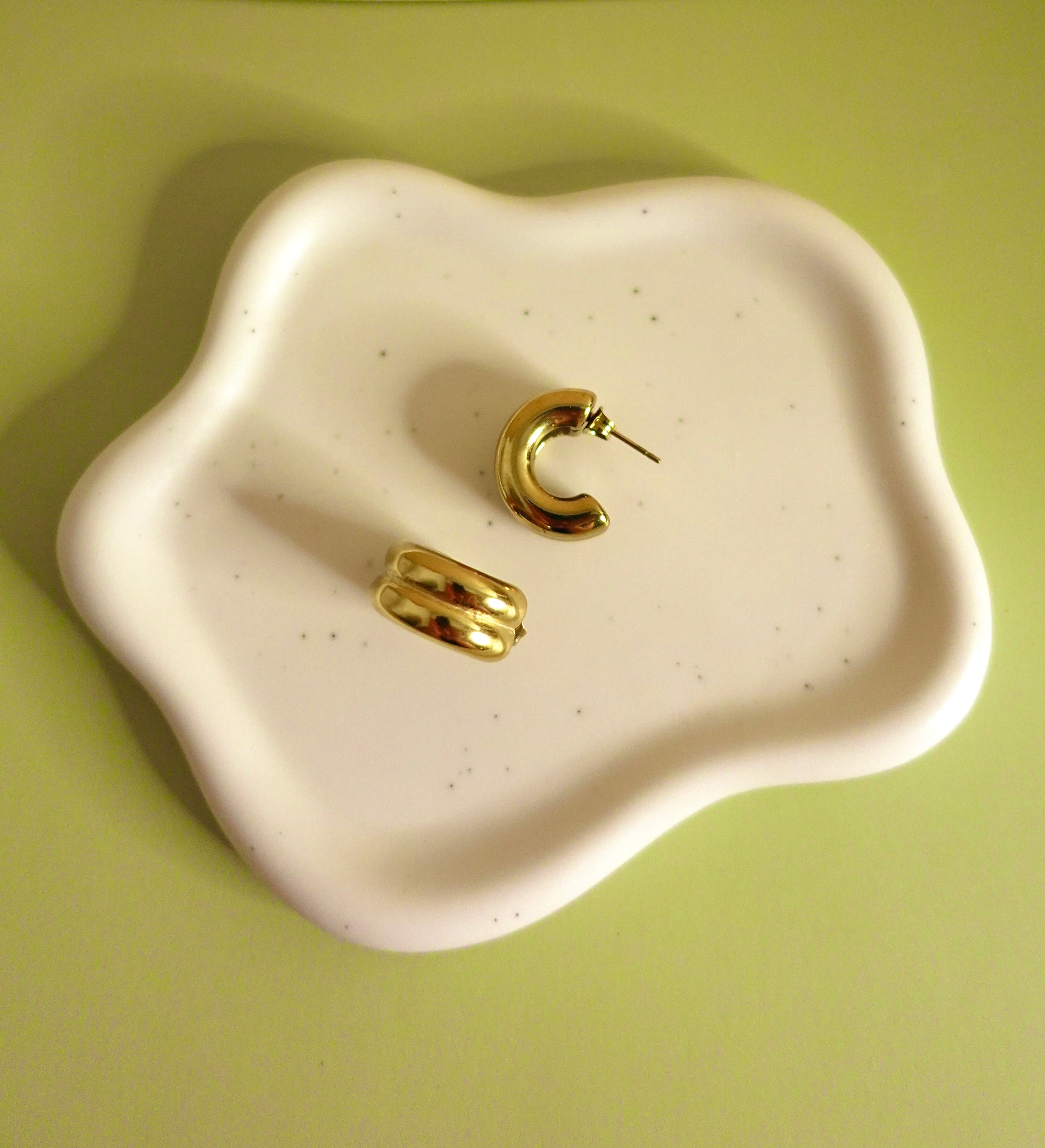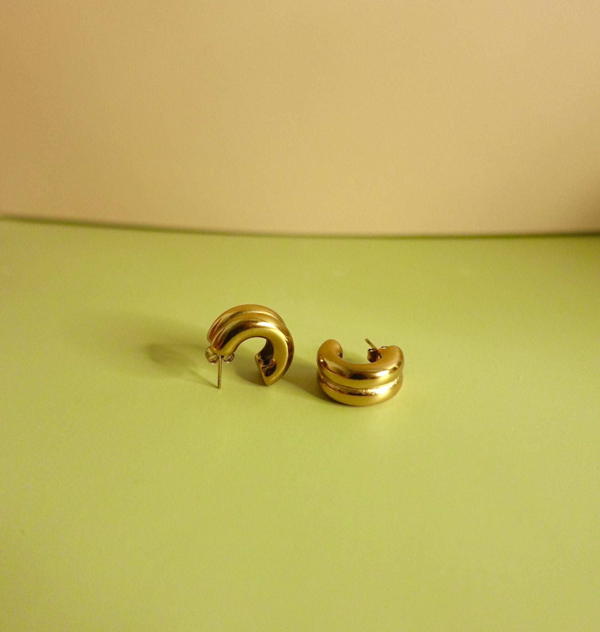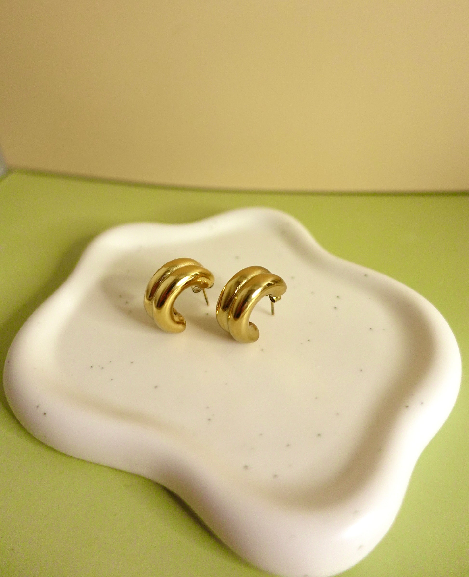 Delicate curves meet radiant gold in these half-circle stud earrings. Plated in 18k gold, they bring a sense of soft structure and refined beauty to any style. Perfect for adding a touch of confidence and quiet luxury—whether you're dressed up or keeping it casual.